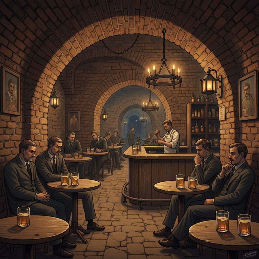 ロウソクの灯りに浮かび上がる壁のひとつひとつの傷には、遠い昔の商人たちの夢の残り香が感じられます。ジャズの即興演奏の合間に訪れる静寂には、抑圧の時代に自由を求めた芸術家たちの魂の叫びが反響しているようです。琥珀色のグラスに揺れるビールの泡は、新しい時代を生きる若者たちの希望の輝きを宿しています。