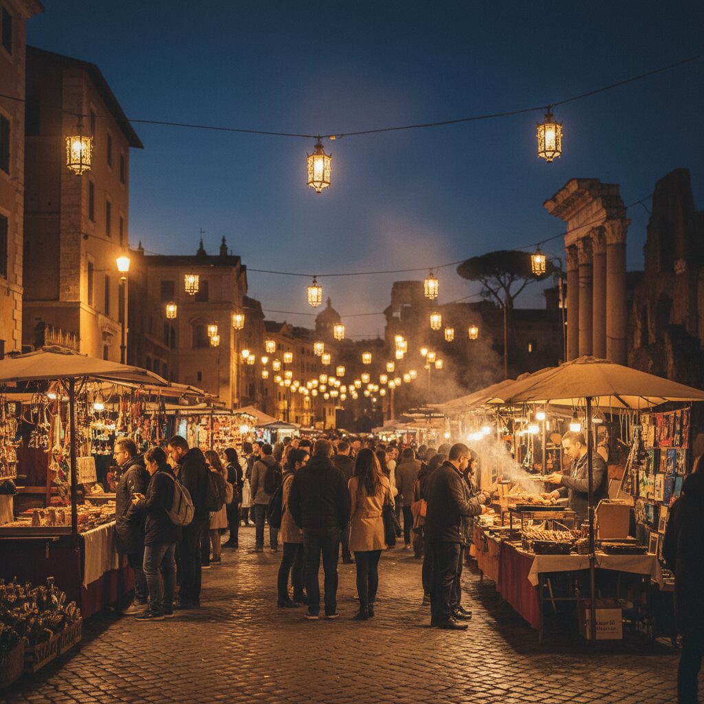 しかし、太陽が西の空に沈み、街が黄金色から深い紫へとその表情を変える頃、ローマはまるで魔法にかかったかのように姿を一変させます。昼間の静けさは心地よい喧騒に変わり、レストランやバーの扉が開放され、ネオンの光が訪れる人々を誘います。そして、その変貌の頂点を飾るのが、夜のマーケットの登場です。