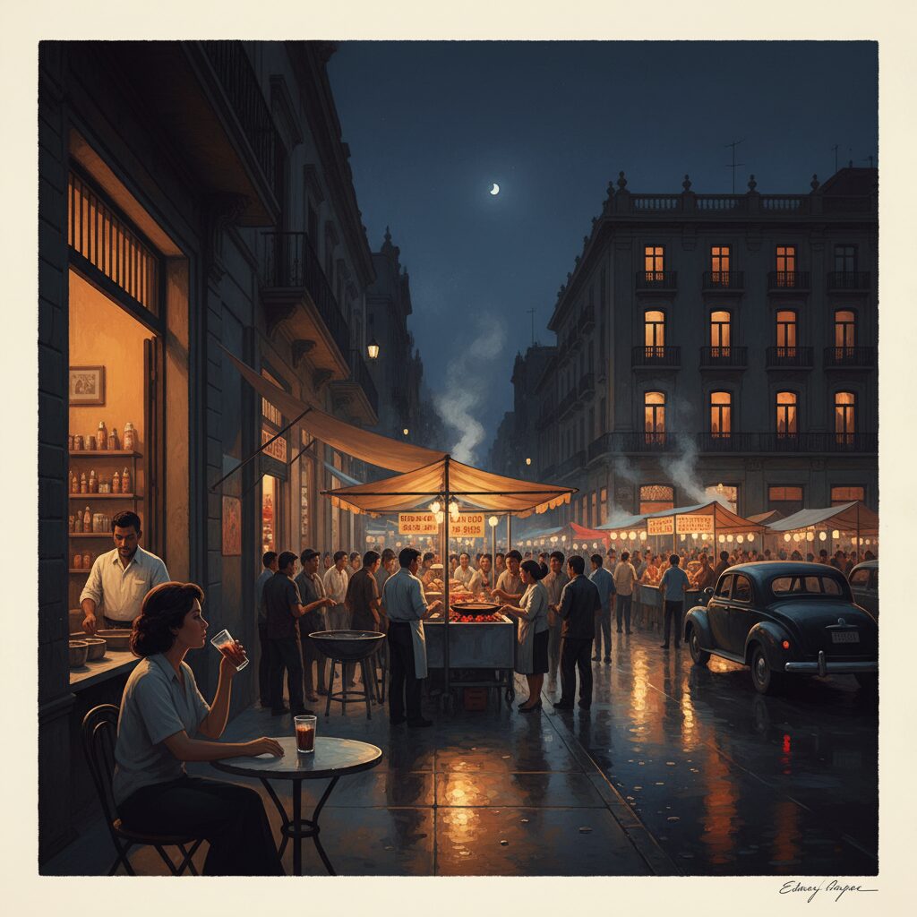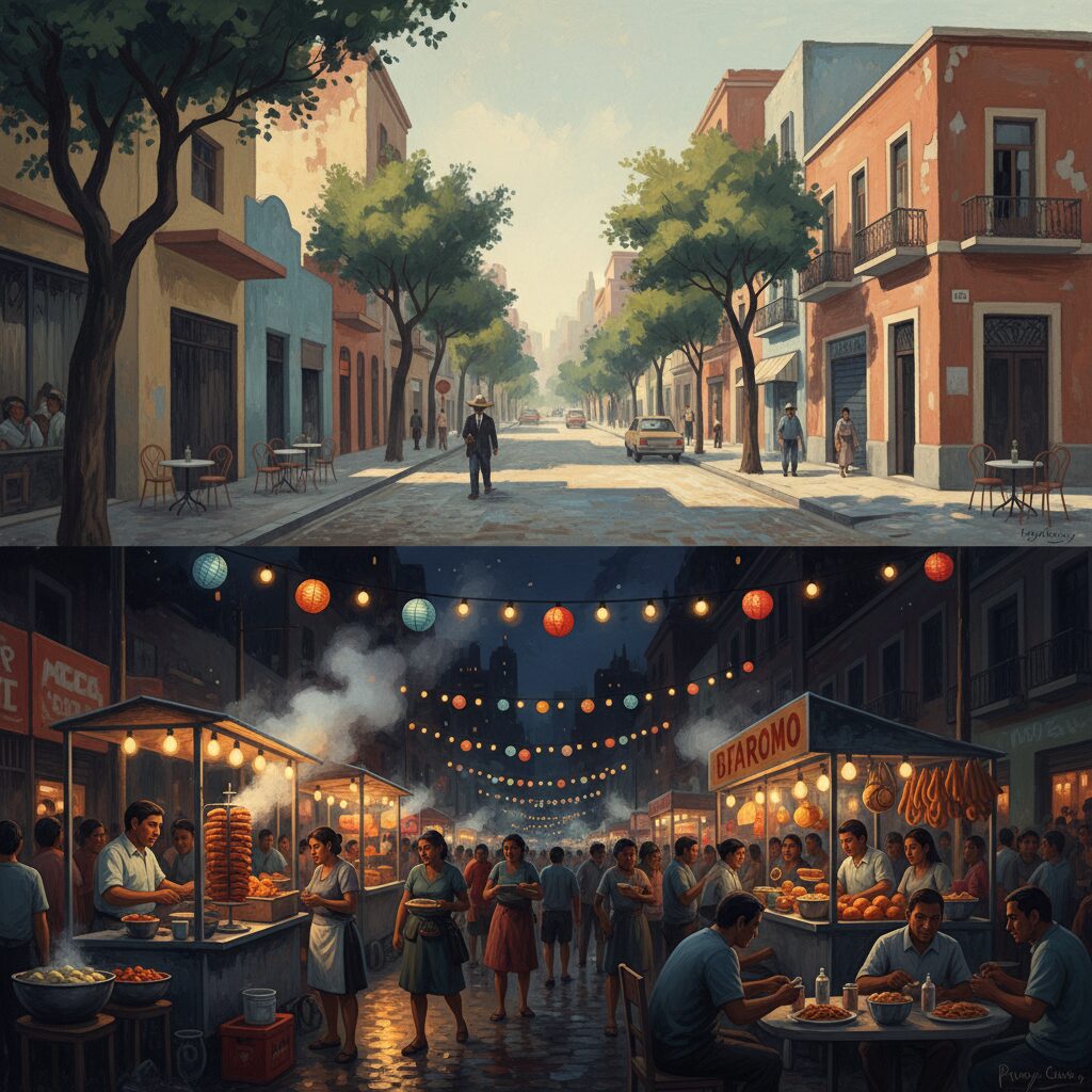 陽が落ち、アール・デコの優美な建物が深い藍色のシルエットに変わる頃、メキシコシティのコロニア・ローマは、もう一つの顔を見せ始めます。昼間の静寂な気品はどこへやら、街灯のオレンジ色の光が石畳を濡らし、人々の笑い声と食欲をそそる香りが夜気と混じり合うのです。ここは、最先端のクリエイティビティと、何世代にもわたって受け継がれてきた生活の温もりが交差する場所。そのエネルギーが最も凝縮されるのが、夜の闇に突如として現れる宝石箱、ナイトマーケットです。